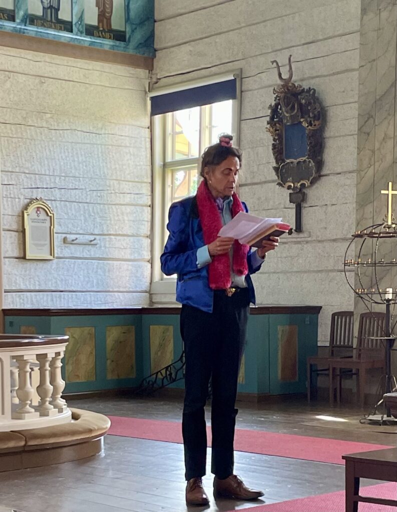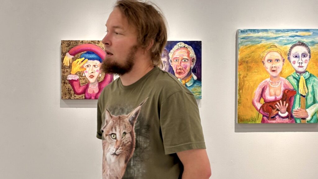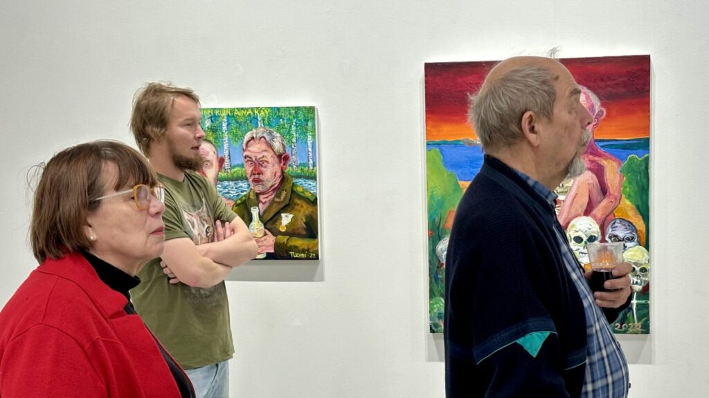 Galleria Mältinrannan näyttely ”Taas kävi niin kuin aina käy” ja tapaaminen taiteilija Juhani Tuomen kanssa houkutteli pyhäinpäinä paikalle yhdistyksen kuusi jäsentä. Marraskuinen ilma – tihkusade, pimeys ja loskaiset kadut varmasti rajoittivat osallistumista mutta paikalle tulleet arvioviat sääesteen voittamisen vaivan arvoiseksi. Upea näyttely ja Juhani Tuomen teoksen taustoja avaava tarinointi antoivat kokonaisvaltaisen taide-elämyksen. Tuomen teokset ovat värikylläisiä ja kantaa ottavia. Juuriltaan tamperelainen mutta Joensuussa asuva taiteilija on taiteen keinoin käsitellyt mm. Venäjän käymää julmaa hyökkäyssotaa Ukrainassa. Sodan julmuus, eurooppalaisten vetäytyminen sivustakatsojiksi, Venäjän johdon piittaamattomuus, sotarikokset ja siviileihin kohdistuvat sotatoimet saivat ankaran tuomion. Murheellisia asioita ja surua voi käsitellä muullakin värillä kuin mustalla – totesi Juhani.