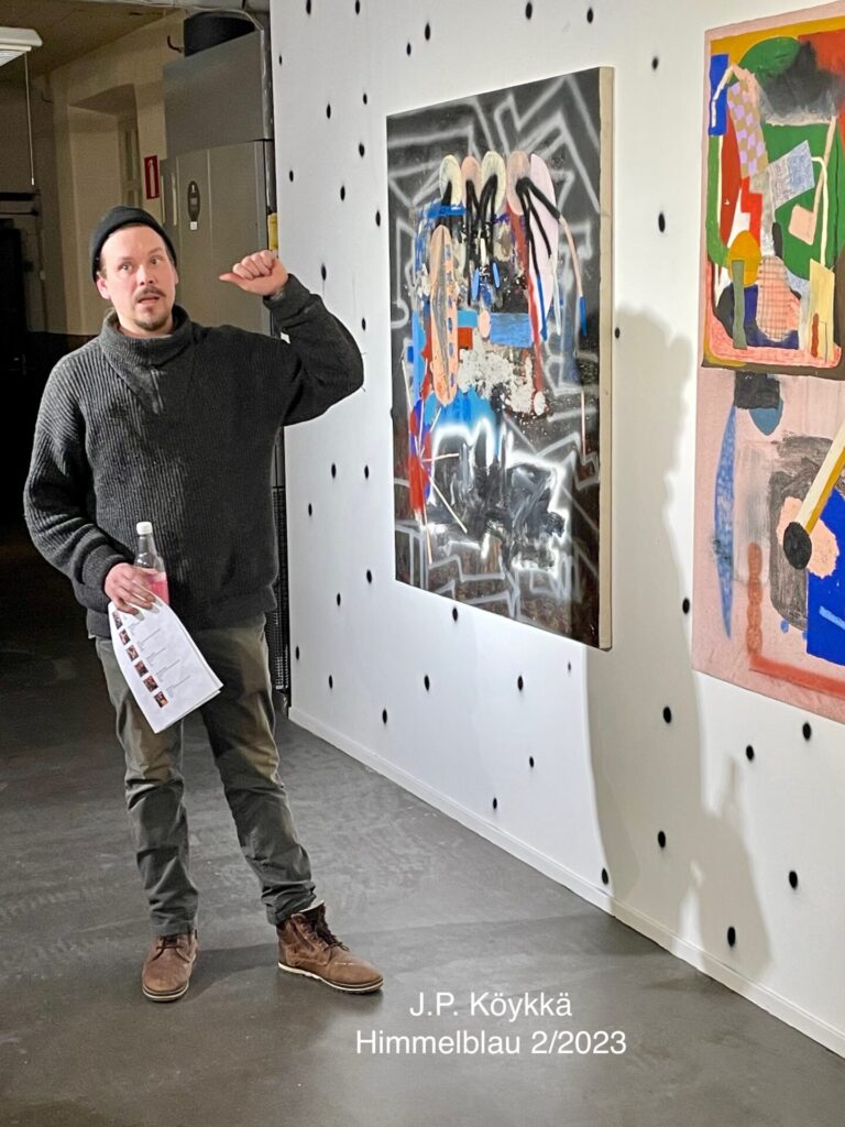 Taidemaalari J-P. Köykkä esitteli yhdistyksemme jäsenille näyttelynsä ”Pressure Escape” Galleria Himmelblaussa. Hän on kuvataiteilija, joka maalarina edustaa modernismin perinteen tuntevaa koulukuntaa. Hän maalaa, piirtää ja tekee kollaaseja sekä ripustaa teokset siten, että niistä tulee installaatioita. Sympaattiseen taiteilijaan ja tämän värikkääseen ja talven pimeyteen iloa tuovaan näyttelyyn tutustui parikymmenpäinen jäsentemme joukko.