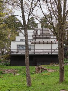 Toinen tutustumiskohteemme oli historiallinen Kauttuan ruukki, joka sijaitsee Eurassa Ahlforsin paperitehtaan kyljessä. Kauniissa kylässä sijaitsi mm. Alvar Aallon suunnittelemia taloja, Ruukin kartano, punamultaisia hirsitaloja, Varkaudesta tuoduista elementeistä tehtyjä omakotitaloja Varkaudenmäellä. Pääsimme sisätiloihin Aallon suunnittelemaan terassitaloon ja jokisaunaan, missä ihastelimme myös Aallon suunnittelemia huonekaluja ja valaisimia. Jokisaunalla kahvittelimme ennen kotiinpaluuta.
